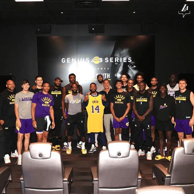 第二天,湖人在官方社交賬號上發(fā)布了分享會的照片。威爾·史密斯站在湖人球員、教練和佩林卡中間,手舉著一件特別定制的球衣,詹姆斯在身旁笑臉相迎,而在他們右側(cè)不遠處,威少站在那里,面無表情,甚至可以說有些憤怒。