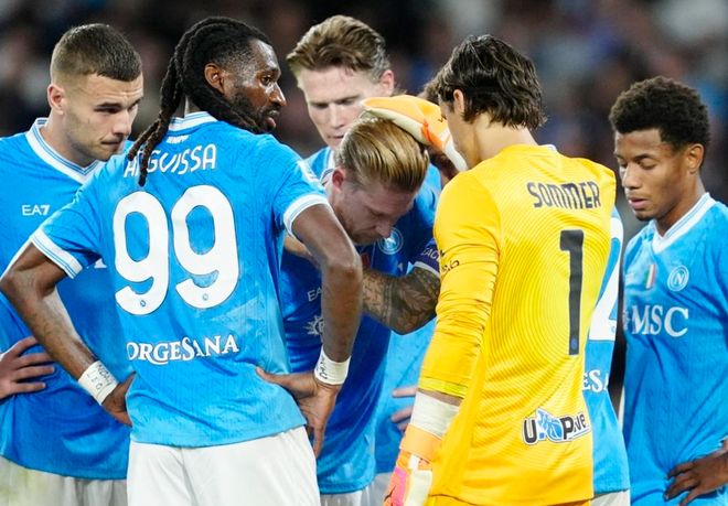 第33分鐘,迪洛倫佐被放倒,裁判判罰點球。德布勞內(nèi)主罰,他穩(wěn)穩(wěn)把球罰進(jìn),幫助那不勒斯取得領(lǐng)先。而德布勞內(nèi)因此拉傷了,不得不被換下場,有些倒霉。第40分鐘,巴斯托尼差一點進(jìn)球,他的頭球攻門擊中了橫梁彈出。半場補時階段,鄧弗里斯頭球攻門,皮球擊中立柱彈出底線。半場結(jié)束,那不勒斯1-0領(lǐng)先國際米蘭。