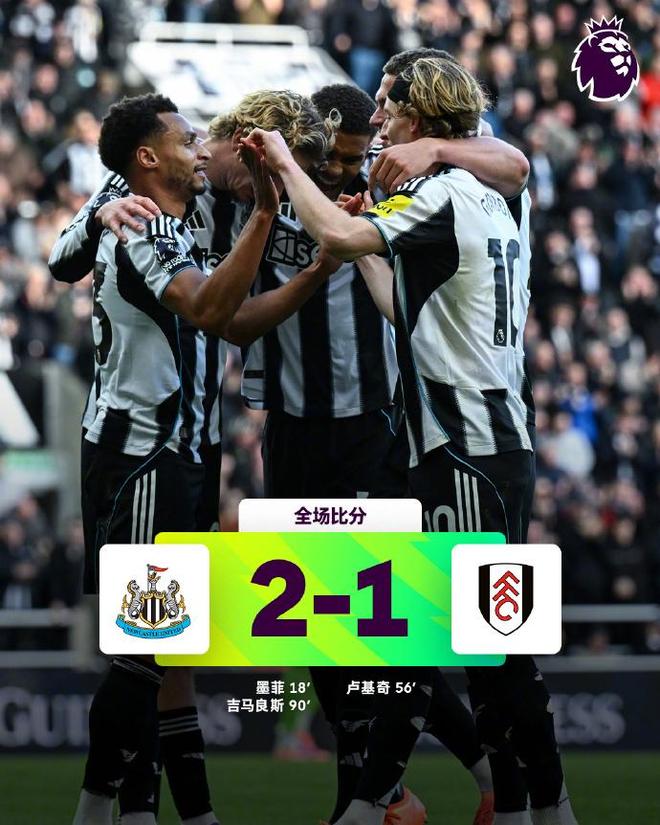 本場比賽,紐卡斯?fàn)栔鲌雒鎸Ω焕漳?,開場第18分鐘依靠雅各布-墨菲的低射破門,取得1-0的領(lǐng)先優(yōu)勢。直到下半場第56分鐘,盧基奇門前頭球補(bǔ)射破門,幫助富勒姆1-1扳平比分。第90分鐘,吉馬良斯補(bǔ)射破門,幫助紐卡斯?fàn)?-1完成絕殺。